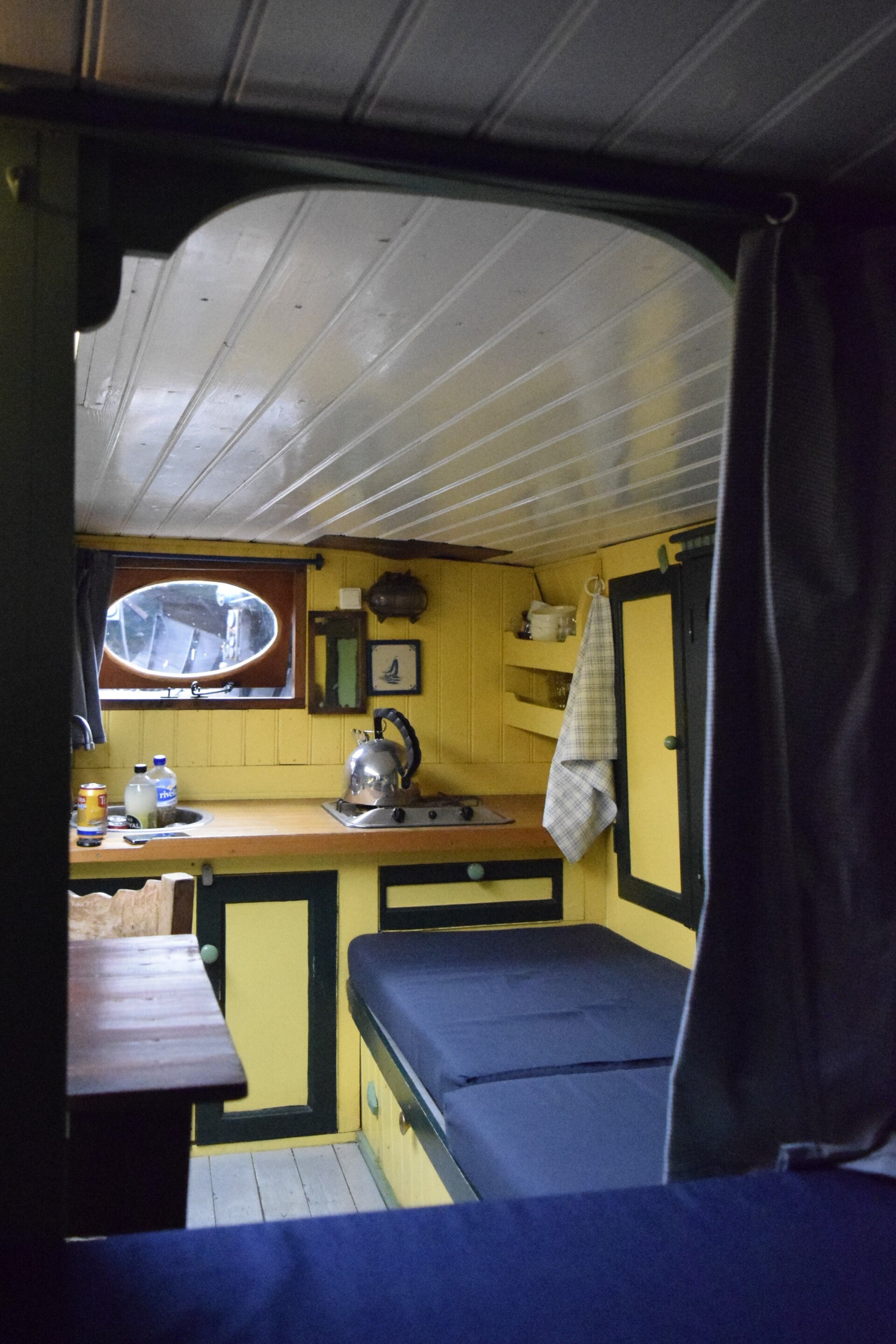 De sfeer van de kajuit is traditioneel en sfeervol.